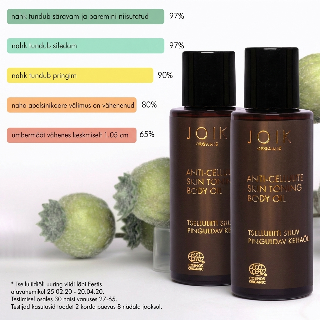 JOIK Organic Tselluliiti siluv ja toniseeriv kehaõli läbis 2020 aasta kevadel kahekuulise kasutajakogemuse uuringu